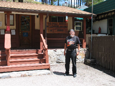 Monday, 8 August 2005. Mt. LemmonFirst thing in the morning I took the Road King to Harley Davidson of Tucson for an oil change. Ron led the way, which was fortunate. The storms of the night before had closed some roads . In many places, bridges are not built over dry riverbeds and streams (called washes), so that when a heavy rain does occur, water flows over the road and may close it for a day or so. Ron knew alternate routes. Although I had originally planned to just wait for the bike, decided to leave it there. When I picked it up later that afternoon, they charged $100 — for an oil change? I bought the mandatory t-shirt though. Ron and Hal then took us to the top of Mt. Lemmon in the Santa Catalina Mountains on the northern outskirts of Tucson. The ride up started misty with low lying clouds which we thought might make the vistas less viewable. But it did clear somewhat as we were going up, and by the time we came down it was mostly fine. Ron cooked another great meal -- roast beef -- and we watched Shirley Valentine. Ron and Hal's movie collection is impressive!