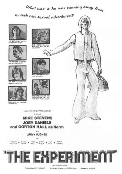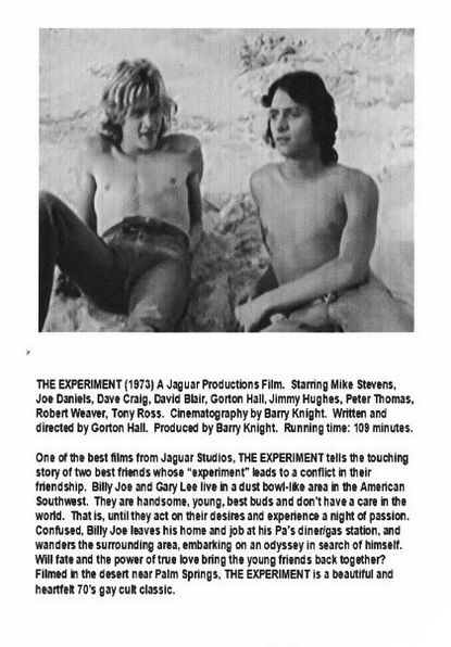 The plot for The Experiment is little more than an envelope to tie together a series of explicit erotic scenes· For 1973 the sex may have been adventuresome, but by today's standards is pretty lame· So, these two young best friends decide to "experiment"· After a few bumps and grinds, they find their "true" selves· The producer and director are experienced porn filmmakers; but overall, the film is pretty banal· Unless you have an interest in the history of queer films, you may want to put this one low on your "to view" list.