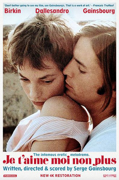 The musical theme -- "Je t'aime… moi non plus" (French for "I love you… me neither") -- is a 1967 song written by Serge Gainsbourg for Brigitte Bardot. In 1969, Gainsbourg recorded the best known version with Jane Birkin. The duet reached number one in the UK, and number two in Ireland, but was banned in several countries due to its overtly sexual content. [Wikipedia]