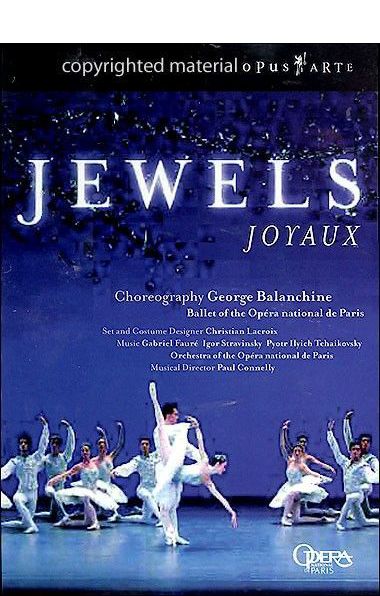 Jewels, ballet in three parts choreographed by George Balanchine for the New York City Ballet. IMDB/DVD version recorded in October / November 2005 at the Opéra National de Paris. YouTube version is by the Bolshoi Ballet, "Jewels is an interesting triumvirate of styles and attitudes that is broken into three 'movements,' Emeralds, Rubies and Diamonds. Emeralds, set to the soothing and melodic post-Impressionism of Gabriel Faure, seeks to espouse the classical French dancing style. Rubies, the most forward-thinking piece in this set, is a wonderfully quirkly examination of American styles, including some fun jazz moves, set to Stravinsky's strident Capriccio for Piano and Orchestra. The most classically redolent piece, Diamonds, set to Tchaikovsky, will probably be the most easily accessible to those brought up on other Tchaikovsky ballets like Swan Lake or Sleeping Beauty, and seeks to incorporate a Russian dance ethos." [DVD Talk]