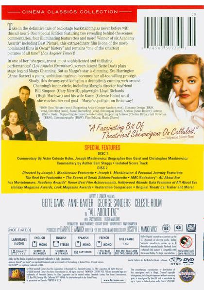 From the moment she glimpses her idol at the stage door, Eve Harrington is determined to take the reins of power away from the great actress Margo Channing. Eve maneuvers her way into Margo's Broadway role, becomes a sensation and even causes turmoil in the lives of Margo's director boyfriend, her playwright and his wife. Only the cynical drama critic sees through Eve, admiring her audacity and perfect pattern of deceit. |