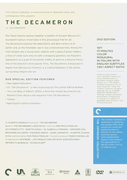 An adaptation of nine stories from Giovanni Boccaccio's 14th century Decameron: • A young Sicilian is swindled twice, but ends up rich; • A man poses as a deaf-mute in a convent of curious nuns; • A woman must hide her lover when her husband comes home early; • A scoundrel fools a priest on his deathbed; • Three brothers take revenge on their sister's lover; • A young girl sleeps on the roof to meet her boyfriend at night; • A group of painters wait for inspiration; • A crafty priest attempts to seduce his friend's wife; • Two friends make a pact to find out what happens after death. Pasolini is up to his old tricks satirizing the Church, and throwing in liberal doses of life and love. |