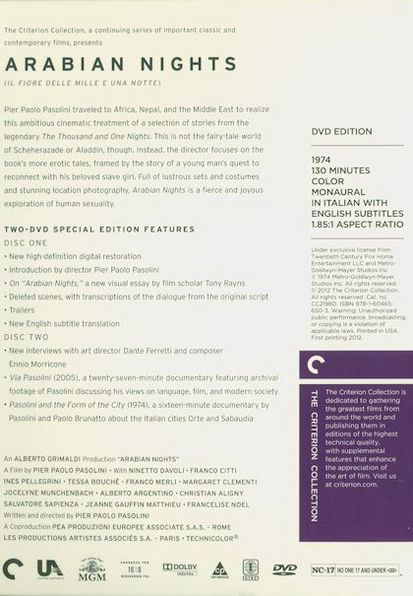 The final part of Pasolini's Trilogy of Life series is rich with exotic tales of slaves and kings, potions, betrayals, demons and, most of all, love and lovemaking in all its myriad forms. Mysterious and liberating, this is an exquisitely dreamlike and adult interpretation of the original folk tales. |