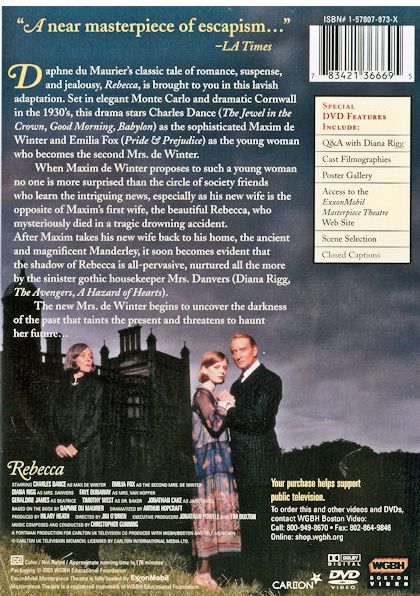 It is inevitable, I suppose, to compare this 1997 Jim O'Brien version of Daphne de Maurier's Rebecca with that of Alfred Hitchcock's 1940 masterpiece · Knowing that this Rebecca was coming up for repeat on PBS, I revisited Hitchcock so as to have it fresh in my mind · Well, I probably be condemned to live out all eternity in hell for the blasphemy of suggesting that they are close to being on a par · Hitchcock builds the Gothic suspense as only he can do, perhaps helped by the black and white filming; O'Brien, no longer bound by the idiotic United Stated censorship rules, better develops the lesbian relationship between the housekeeper Mrs· Danvers and the first Mrs· de Winter · The acting in both is superb.