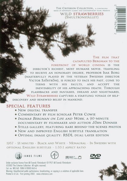 Crotchety retired doctor Isak Borg travels from Stockholm to Lund, Sweden, with his pregnant and unhappy daughter-in-law, Marianne, in order to receive an honorary degree from his alma mater. Along the way, they encounter a series of hitchhikers, each of whom causes the elderly doctor to muse upon the pleasures and failures of his own life. These include the vivacious young Sara, a dead ringer for the doctor's own first love. |