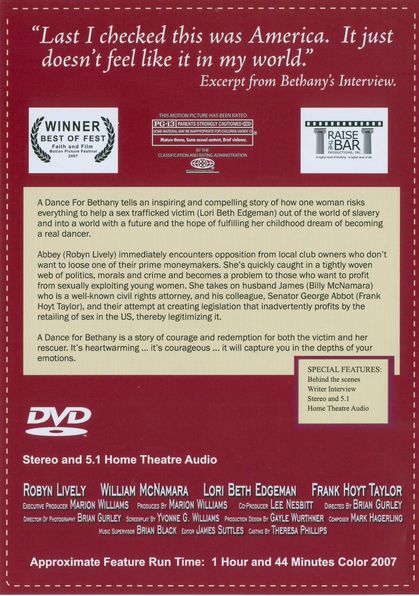 Investigator reporter Abbey Fisher always thought she wanted the traditional American Dream: a husband and children of her own. When life and fertility stand in her way, Fisher (played by Robyn Lively) leverages her journalism know-how and uncovers the rapidly growing American sex trade preying on children and youth. Fisher and her husband come to know Bethany (Lori Beth (Edgeman) Sikes), a twelve year old victim of pernicious trafficking. As Bethany learns and grows, so do the Fishers as they take the battle against circumstances and government to protect others from Bethany's experiences. |