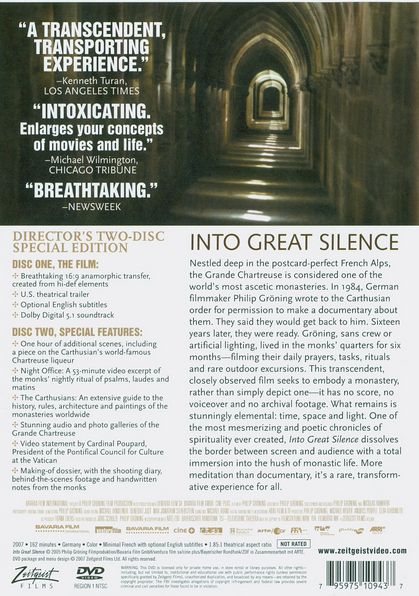 Into Great Silence (German: Die Große Stille) is a documentary film directed by Philip Gröning that was first released in 2005. It is an intimate portrayal of the everyday lives of Carthusian monks of the Grande Chartreuse, high in the French Alps (Chartreuse Mountains). The idea for the film was proposed to the monks in 1984, but the Carthusians said they wanted time to think about it. The Carthusians finally contacted Gröning 16 years later to say they were now willing to permit Gröning to shoot the movie, if he was still interested.