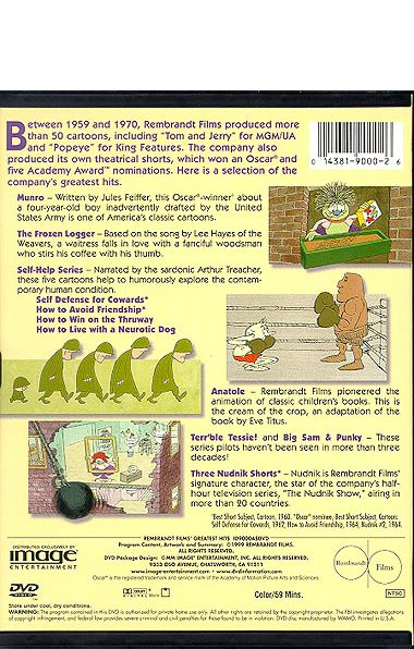 Between 1959 and 1970, Rembrandt Films produced more than 50 cartoons, including Tom and Jerry for MGM/UA and Popeye for King Features. The company also produced its own theatrical shorts, which won five Academy Award nominations and one Oscar. This compilation includes: "Munro" - Written by Jules Feiffer, this Oscar-winner about a four-year-old boy inadvertently drafted by the United States Army is one of America's classic cartoons; "Frozen Logger" - Based on the song by Lee Hayes of the Weavers, a waitress falls in love with a fanciful woodsman who stirs his coffee with his thumb; "Self-Help Series" - Narrated by the sardonic Arthur Treacher, these cartoons--"Self Defense for Cowards," "How to Avoid Friendship," "How to Win on the Thruway," "How to Live with a Neurotic Dog"--help to humorously explore the contemporary human condition; "Anatole" - Rembrandt Films pioneered the animation of classic children's books. This is the cream of the crop, an adaptation of the book by Eve Titus; "Terrible Tessie," "Big Sam" and "Punky" - These series pilots have not been seen in more than three decades; "Three Nudnik Shorts" - Nudnik is Rembrandt Films' signature character, the star of the company's half-hour television series, "The Nudnick Show," airing in more than 20 countries.