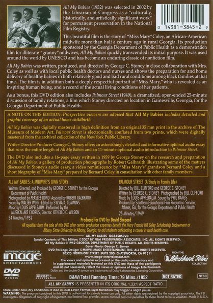 This beautiful film is the story of "Miss Mary" Coley, an African-American midwife more than half a century ago in rural Georgia. Conceived as a demonstration film for illiterate "granny" midwives, its production sponsored by the Georgia Department of Public Health, All My Babies quickly transcended its initial purpose. It was used around the world by UNESCO and has become an enduring classic of non-fiction film. |