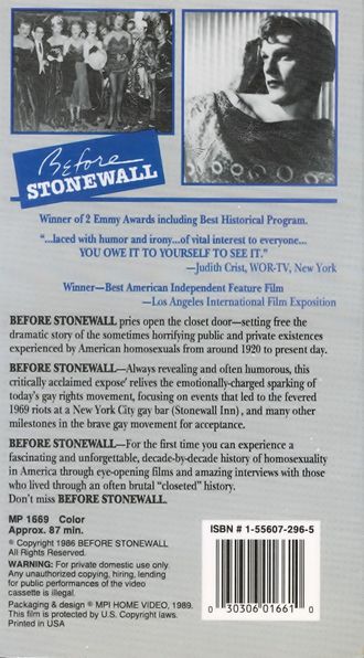 New York City's Stonewall Inn is regarded by many as the site of gay and lesbian liberation since it was at this bar that drag queens fought back against police June 27-28, 1969. This documentary uses extensive archival film, movie clips and personal recollections to construct an audiovisual history of the gay community before the Stonewall riots.