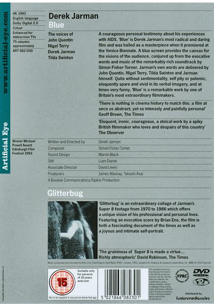 This dvd contains Derek Jarman's last films before his death. By the time of Blue (1993), Jarman was losing his sight and dying of AIDS-related complications. Blue consists of a single shot of saturated blue color filling the screen, as background to a soundtrack composed by Simon Fisher Turner, and featuring original music by Coil and other artists, in which Jarman describes his life and vision. When it was shown on British television, Channel 4 carried the image whilst the soundtrack was broadcast simultaneously on BBC Radio 3. His final testament as a film-maker was the film Glitterbug made for the Arena slot on BBC Two, and broadcast shortly after Jarman's death.