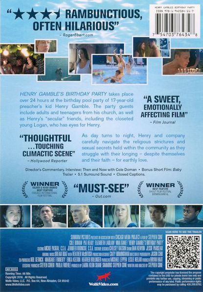 Henry Gamble's Birthday Party takes place over 24 hours at the birthday pool party of 17-year-old preacher's kid Henry Gamble. The party guests include adults and teenagers from his church, as well as Henry's "secular" friends, including the closeted young Logan, who has eyes for Henry. |