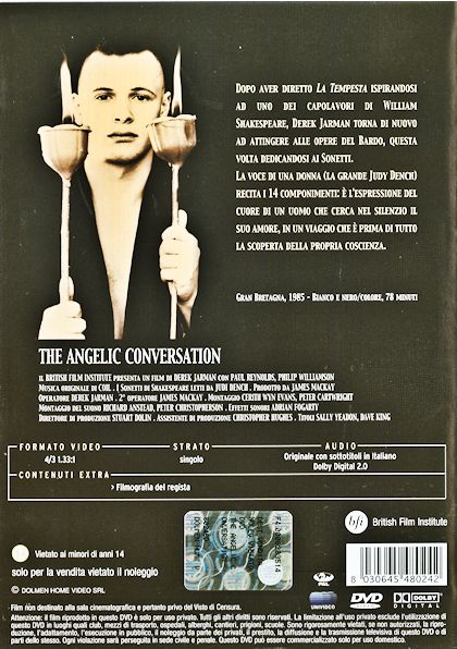 While I am a Derek Jarman fan, The Angelic Conversation is my least favorite of his feature length films· I have watched it several times both using my personal dvd and streaming on Fandor. There is not just one thing (which I often would minimize its importance), but a collection of issues (often very personal)· The concept of using the Shakespeare love sonnets as the arch of the film is beautiful; unfortunately Shakespearian spoken language is difficult for me to understand and English subtitles were not available-the problems is not with Judi Dench's near perfect timbre or diction, though· I suggest downloading the text of the sonnets available in the links section· Even with the text in front of me, Jarman's images often seemed disconnected from the words· Jarman seems to find little joy in love or love-making· Phillip Williamson and Paul Reynolds are mostly expressionless· They remind me of high-fashion models with their pouty faces· Even when one of them is frolicking in the water, he does not seem to be having fun-instead he is just going through a series of poses for the cameraman· Jarman's use of slow motion stop photographic techniques is interesting at first, but not too far into the film begins to grow annoying, and by its end gave me a headache· Finally, while I usually am appreciative of "modern" music, Coil's music for Angelic Conversation often seemed disconnected from both the poetry of the images and spoken word·